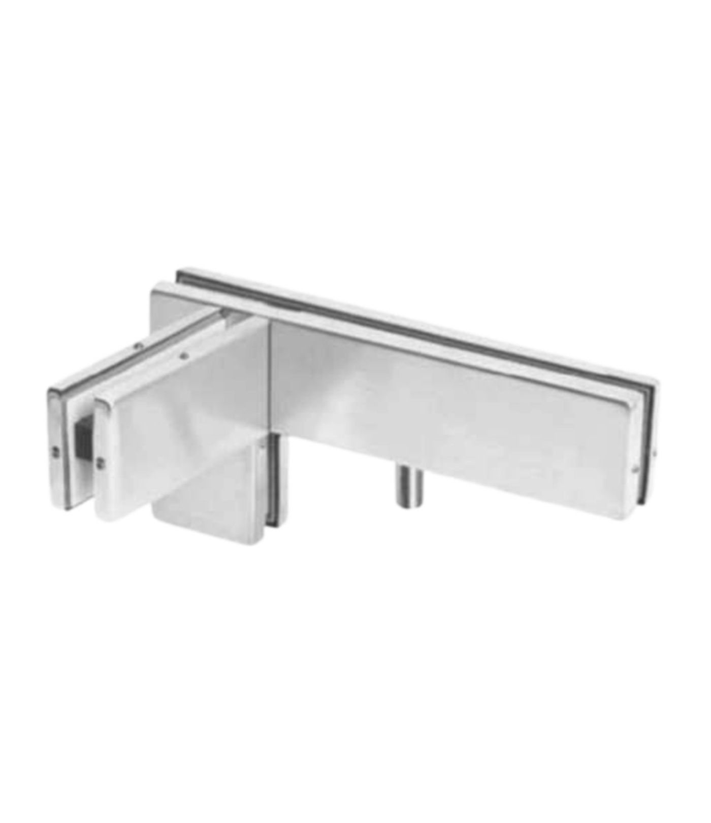 Herraje superior con escuadra y porta costilla, se usa para conectar mampara vidriada fija a puerta y tiene soporte para vidrio tipo costilla que le da más rigidez a la estructura.